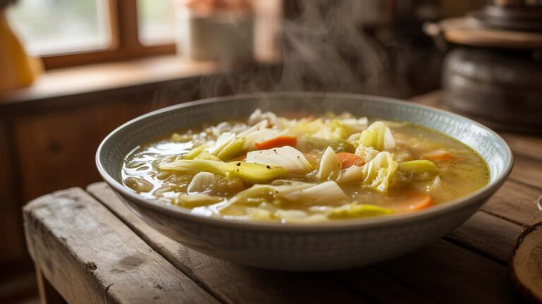Una sopa que combina col blanca con puerro y zanahorias es nutritiva y reconfortante. Se hierven los ingredientes en un caldo, proporcionando un plato saludable y sabroso.
